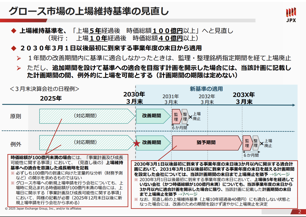 現在の基準は「上場10年経過後に時価総額40億円以上」だが、2030年以降は「上場5年経過後に時価総額100億円以上」へと見直される予定だ。