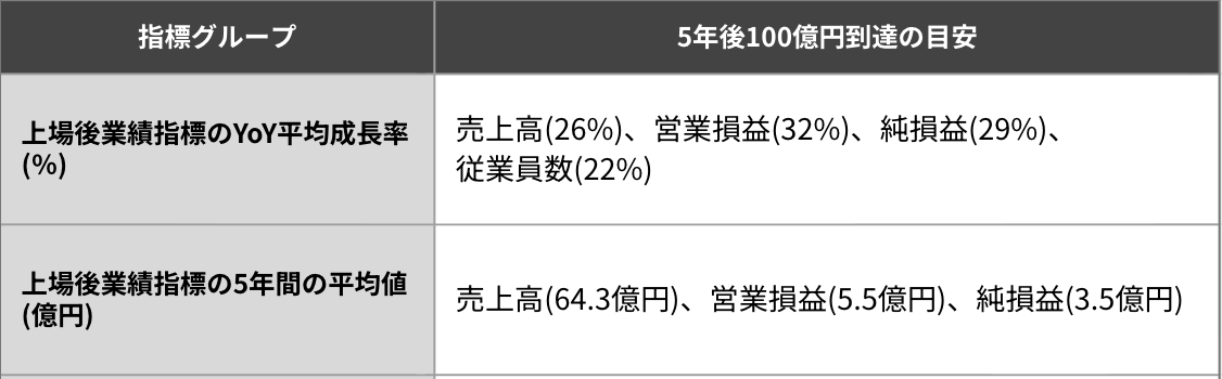 成長率では、売上高・営業損益・純損益のいずれも年平均で30%前後の成長を5年間にわたり継続する必要がある。具体的には、売上高26%、営業損益32%、純損益29%程度が1つの目安となる。