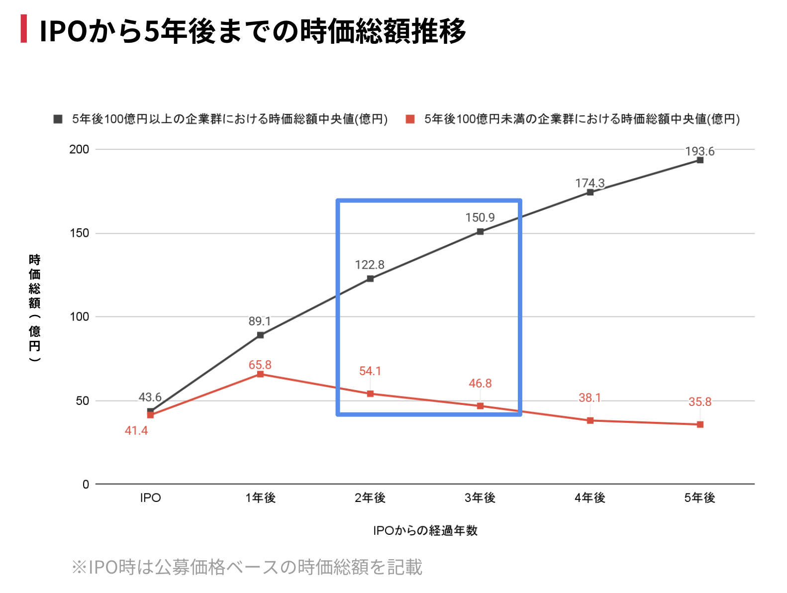 上場後に持続的に企業価値を高めていくためには、IPOの時点から数年間でどれだけ成長ストーリーを示せるかが重要になる。今回の分析では、上場2年目以降に時価総額の明暗がはっきりと分かれることが確認された。