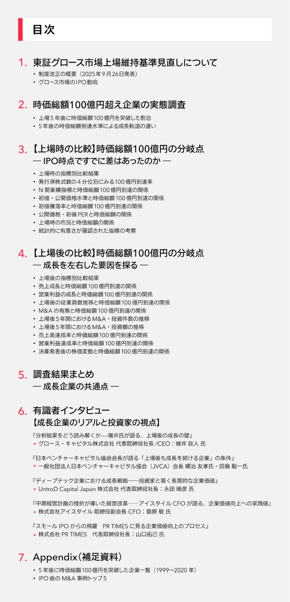 こうした背景を踏まえ、Speedaでは過去に時価総額100億円未満で上場した377社を対象に、上場後5年以内に100億円へ到達した企業と、到達しなかった企業を、財務指標や株価推移など多角的なデータから比較分析した。その結果を基に、グロース市場で求められる成長水準をより具体的に示すことを試みた。