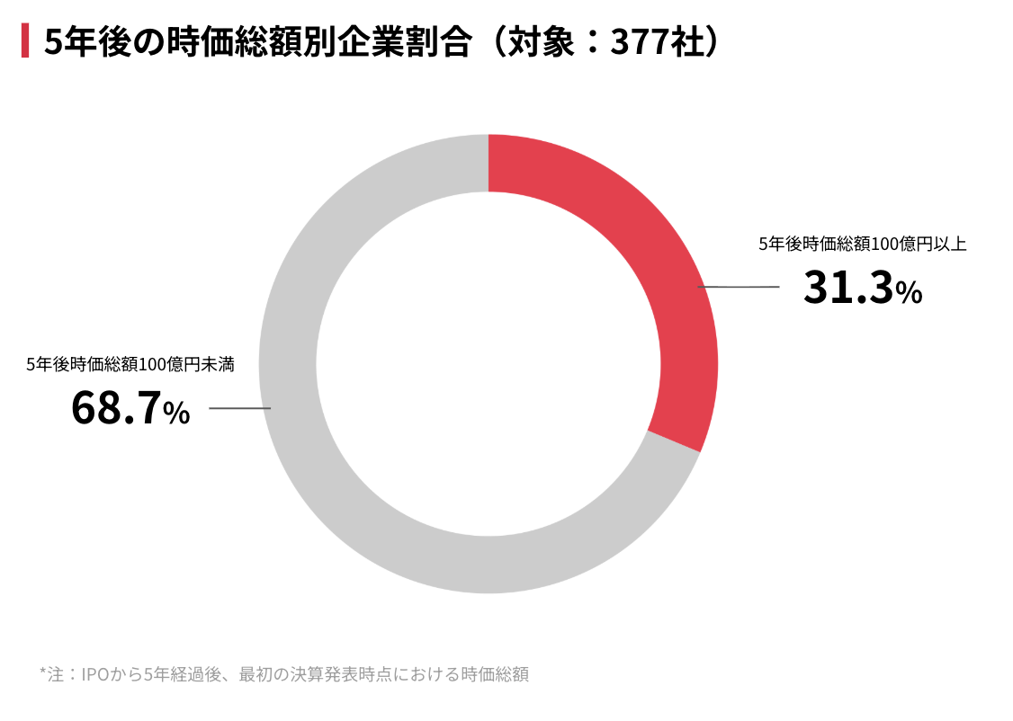 377社のうち、上場5年後に時価総額100億円を超えた企業は118社で全体の31%にとどまった。多くの企業がIPO後に十分な企業価値の拡大につなげられていない現状が浮き彫りとなった。