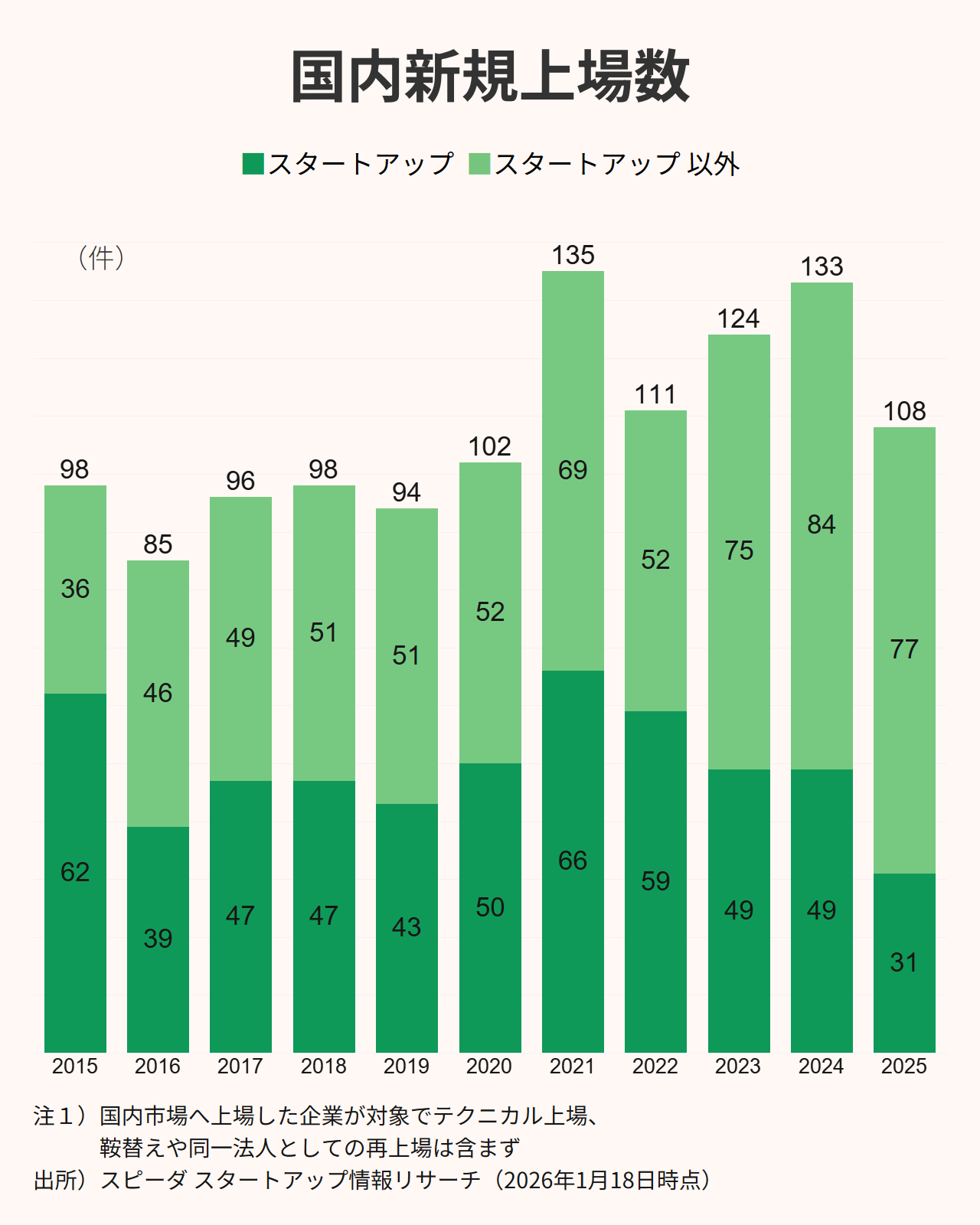 2025年のIPOは108社と、2024年の133社から減少した。そのうちスタートアップは過去10年で最低の31社であった。背景には市況要因に加え、2025年9月に制度要綱が公表された東証グロース市場における上場維持基準の見直しの影響も無視できない。