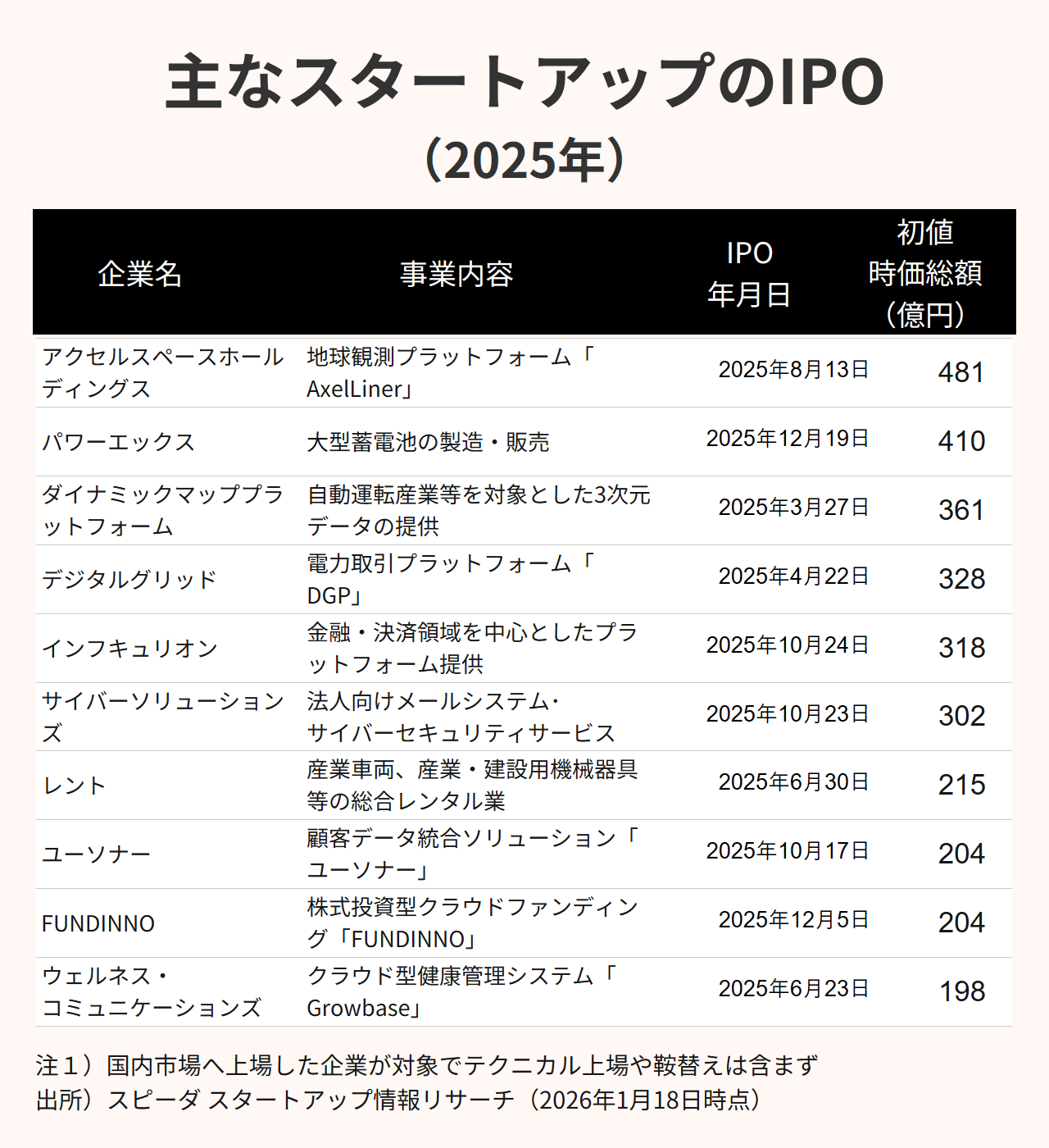 初値時価総額は、小型衛星の開発・運用を手がけるアクセルスペースホールディングスが481億円と、2025年のスタートアップIPOでは最大規模となった。同社は宇宙特化型スタートアップとしては5社目のIPOであり、先行企業と同様、宇宙分野の成長性に対する市場の高い期待が反映された形だ。