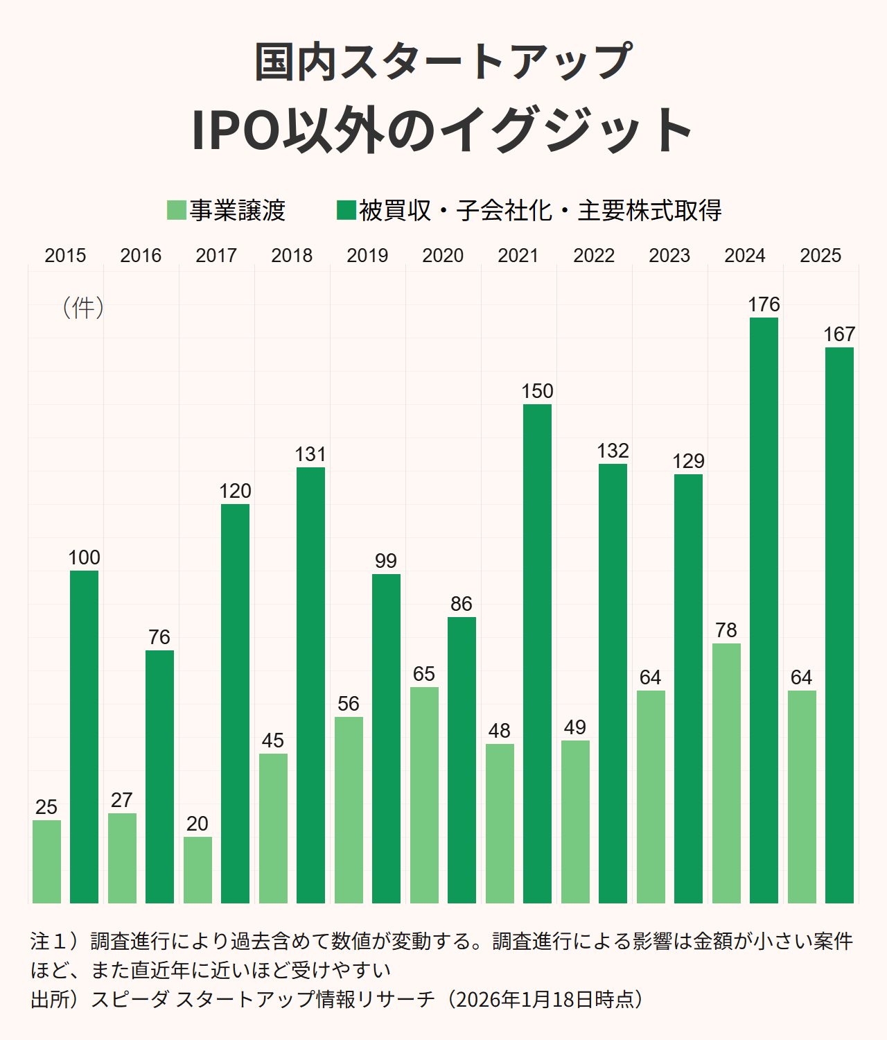 IPO申請を見直し、M&Aを選択する例もあった。ThinkingsはIPO申請準備に入っていたが、AIによる事業環境の変化を踏まえ、より大きな価値創出を志向する選択としてM&Aを選んだことを代表がnoteで明かしている。こうした動きは、スタートアップ側だけでなく、投資家側においても、IPOを唯一の出口とする考え方が見直されつつあることを示している。