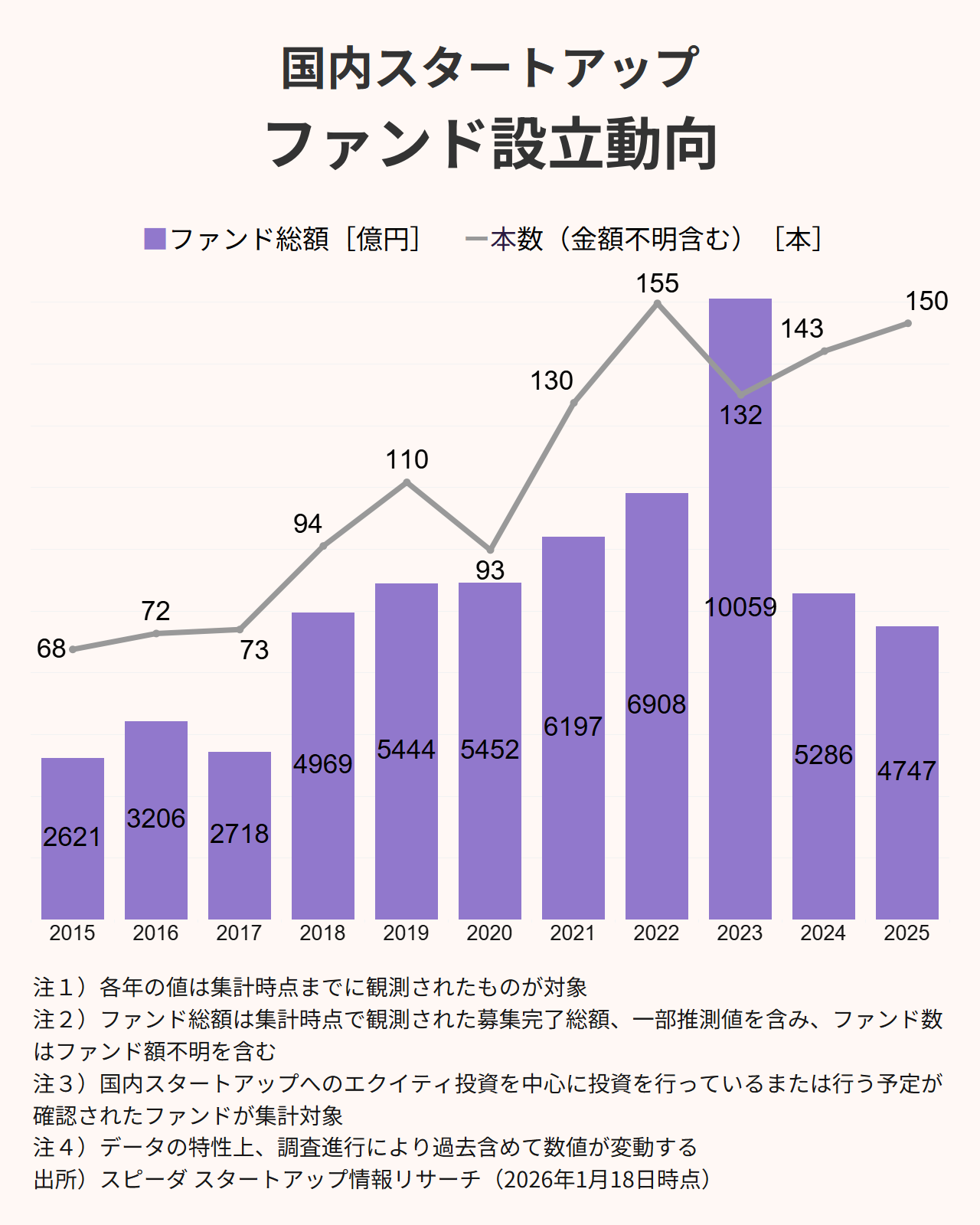 2025年に設立されたファンドは150本、ファンド総額は4747億円であった。調達額同様に、2025年6月末時点で進捗が前年を下回っていたが、結果として前年値(2025年1月集計時点の112本、3870億円)を上回った。但し、金額不明が67本(全体の45%)に達し、増加分の相当部分が「規模の見えないファンド」によって占められた。