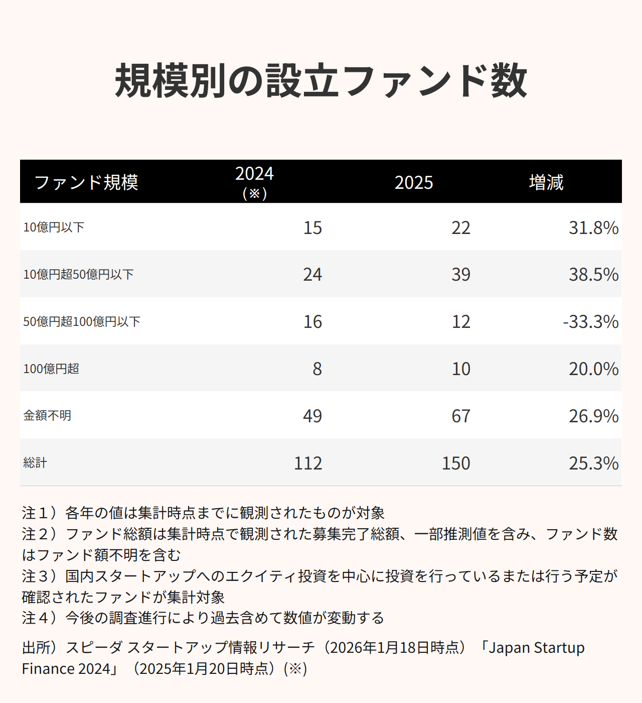 規模別では、50億円以下は61本と前年値(2025年1月集計時点の39本)から増加する一方、50〜100億円以下12本(前年値16本)に減少しており、標準的なファンド規模が小型化している。